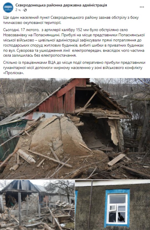 "Сегодня, 17 февраля, из артиллерии калибра 152 мм была обстреляна деревня Новозвановка на Попаснянщине. Прибывшие на место представители Попаснянской городской военно-гражданской администрации зафиксировали прямые попадания в хозяйственные постройки жилых домов, выбиты стекла в частных домах по ул. Суворова и повреждены линии электропередач, в результате чего часть села осталась без электроснабжения", - говорится в сообщении.