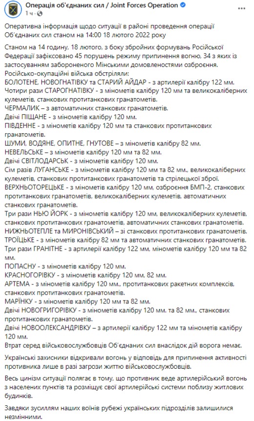 Ближе к вечеру по донецким и российским телеграмм-каналам прошла информация, что из посёлков, которые примыкают к линии фронта с обоих сторон (то есть, и с "ЛДНР", и с Украины) готовится эвакуация населения в связи с предстоящим обострением.