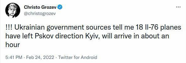 22:17 Советник главы Офиса президента Арестович сообщил, что теперь Гостомель точно отбит. Об этом же в эфире Украина 24 заявила нардеп Евгения Кравчук