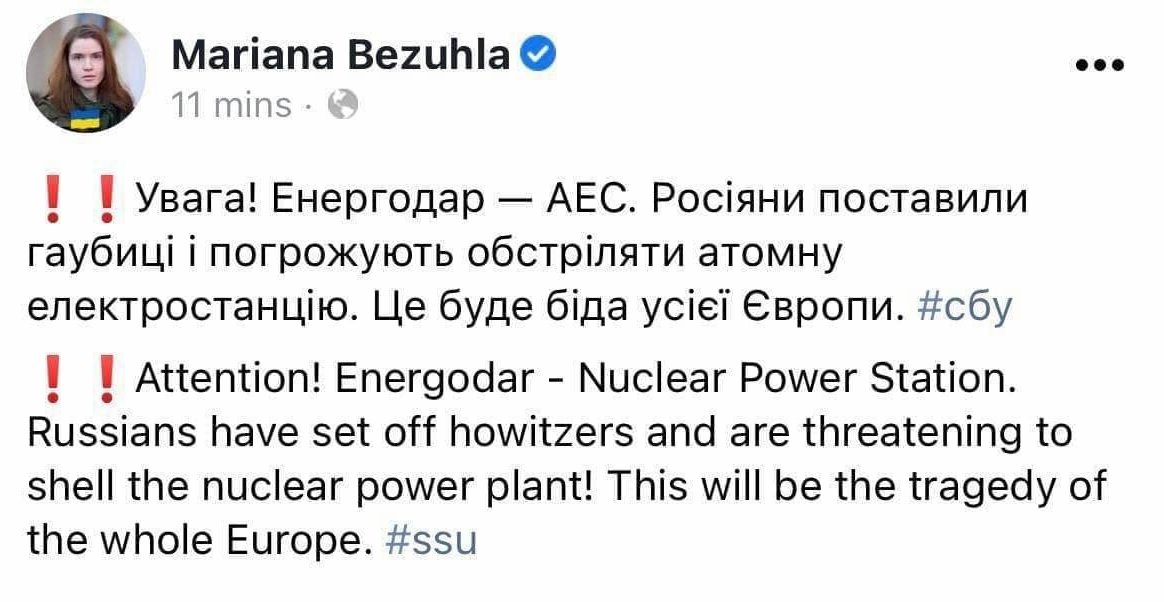 21:22 Нардеп Марьяна Безуглая говорит, что российские войска установили артиллерию близ Энергодара (город около Запорожской АЭС).