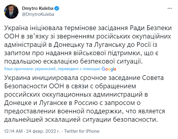 "Украина запросила срочное заседание Совета Безопасности ООН в связи с обращением российских оккупационных властей в Донецке и Луганске к России с просьбой оказать им военную помощь, что является дальнейшей эскалацией ситуации в сфере безопасности", - говорится в публикации главы украинского внешнеполитического ведомства.
