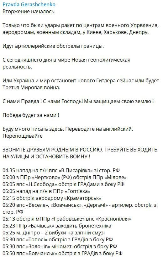 "Только что были удары ракет по центрам военного упрвления, аэродромам, военным складам, в Киеве, Харькове, Днепре. Идут артиллерийские обстрелы границы", - написал он.