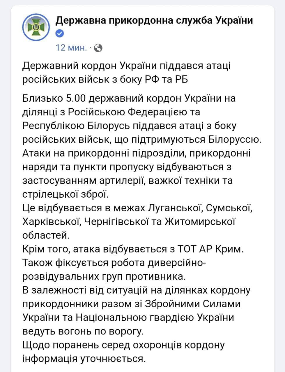 В Госпогранслужбе Украины заявили, что российские войска при поддержке Беларуси атаковали украинскую границу на участке с РФ и Беларусью около 05:00.