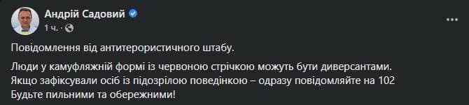 "Люди в форме камуфляжа с красной лентой могут быть диверсантами. Если зафиксировали лиц с подозрительным поведением - сразу сообщайте на 102. Будьте бдительны и осторожны!", - написал мэр Львова.