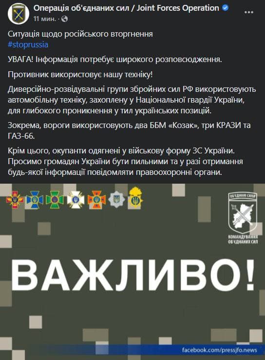 О том, что российские военные могут перемещаться на захваченной технике в форме ВСУ, также предупреждает Штаб ООС.