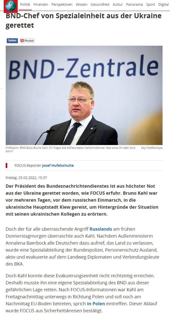 Бруно Каль отправился в Киев для обсуждения ситуации с коллегами. "Но неожиданное для всех нападение России рано утром в четверг удивило и Каля. После того, как министр иностранных дел Анналена Бербок призвала всех немцев покинуть страну, специальный отдел федеральной полиции по личной охране за границей принял меры и эвакуировал дипломатов и офицеров связи по суше", - пишет Focus.