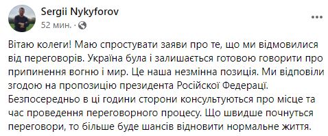 "Должен опровергнуть заявления о том, что мы отказались от переговоров. Украина была и остается готовой говорить о прекращении огня и о мире. Это наша постоянная позиция. Мы ответили согласием на предложение президента Российской Федерации. Непосредственно в эти часы стороны консультируются о месте и времени проведения переговорного процесса. Чем быстрее начнутся переговоры, тем больше будет шансов возобновить нормальную жизнь" - написал пресс-секретарь.