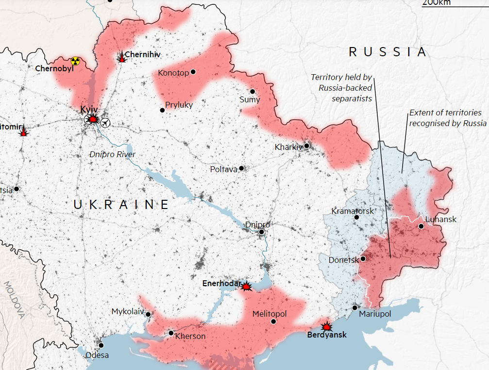 Если смотреть на карту боевых действий, составленную The Financial Times, то видно, что россияне действительно близко к Житомирской трассе на западе от Киева.