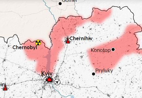 На востоке российские войска уже в районе Прилук. Это в 40 километрах от дороги Киев-Харьков на участке Пирятина, и в 70 километрах - на участке Яготина (то есть ближе к Борисполю).