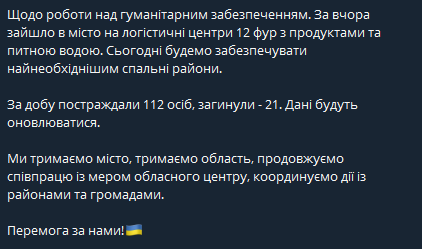 Об этом сообщил глава облгосадминистрации (ОГА) Олег Синегубов в Telegram-канале.
