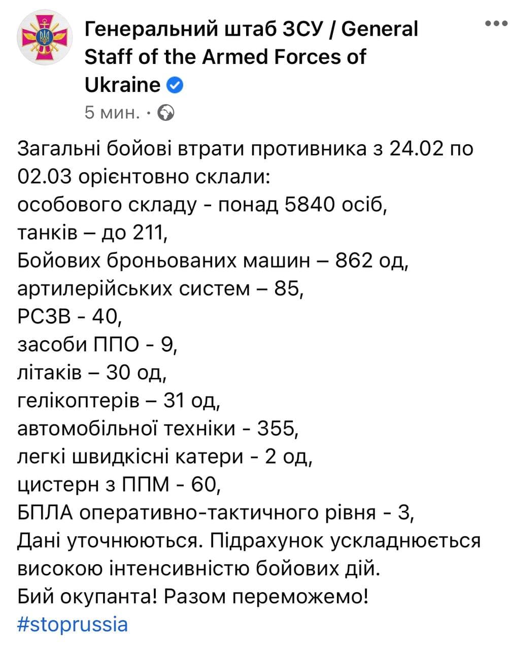 За шесть дней войны в Украине погибли почти 6 тысяч российских военных - Генштаб ВСУ