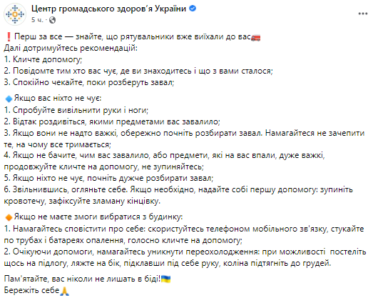 В Центре общественного здоровья Украины рассказали о том, как нужно себя вести и, что необходимо предпринимать, оказавшись под завалами разрушенного дома.