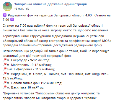 "По состоянию на семь часов радиационный фон на территории Запорожской области остается без изменений и не несет угрозы жизни и здоровью населения", - заявили в ОГА.