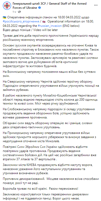 По данным Генерального штаба Вооружённых сил Украины, сегодня, 4 марта, основные усилия оккупантов сосредотачивались на окружении Киева и ослаблении сопротивления в блокированных им населенных пунктах. ВСУ также сообщают, что в город Чернигов осуществляет героическую оборону, а в Киев продолжает отбивать атаки врага.