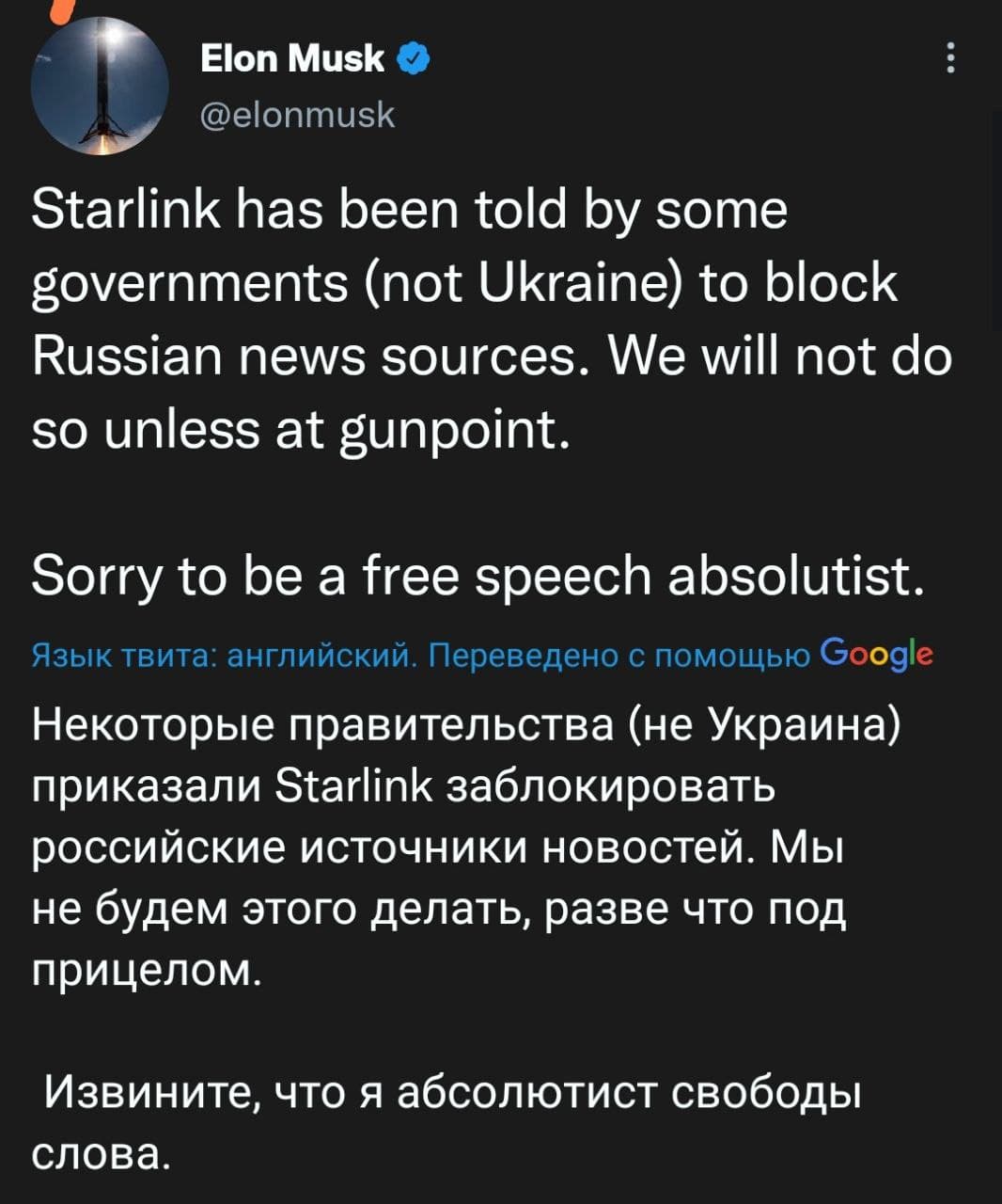 Сказал, что сделает это лишь под дулом пистолета. Поскольку является абсолютным сторонником свободы слова. По словам Маска, его просили об этом некоторые правительства, но не украинское.