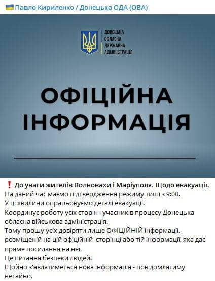 09:16 Глава Донецкой ВГА Павел Кириленко подтвердил начало режима тишины с 09:00 для эвакуации жителей Мариуполя и Волновахи. Детали эвакуации ещё согласовываются.