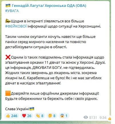 10:54 Херсонский губернатор Лагута опровергает информацию о том, что российские солдаты в Херсоне изнасиловали 11 девушек. Об этом на днях писали многие украинские телеграмм-каналы.