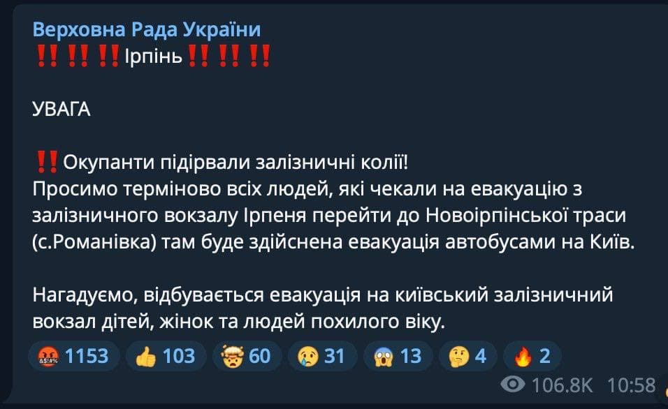 Всех людей, которые ждали эвакуации на ж/д вокзале Ирпеня, просят перейти на Новоирпенскую трассу (с. Романовка). Оттуда автобусами отвезут в Киев.