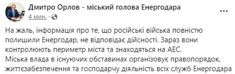 19:27 Мэр Энергодара Дмитрий Орлов опровергает появившуюся ранее информацию, что российские войска покинули город. По его слова, военные РФ контролируют периметр города и находятся внутри АЭС.