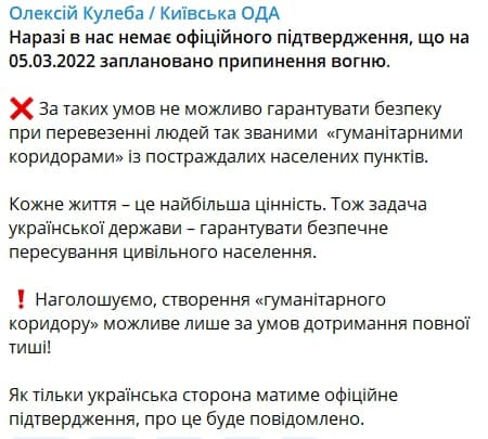 По его словам, без этого нельзя гарантировать безопасность "коридора". На 5 марта таких гарантий РФ не давала.