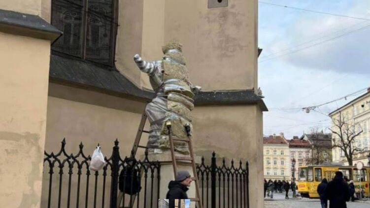 В центре Львова обмотали поролоном и пленкой старинные статуи, для защиты от возможной атаки на город.