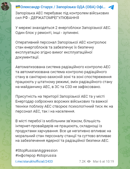 По словам губернатора Запорожской области, присутствие на территории ЗАЭС и Энергодара вооруженных российских оккупантов и тяжелой техники вблизи АЭС оказывает психологическое давление как на персонал АЭС, так и на население.