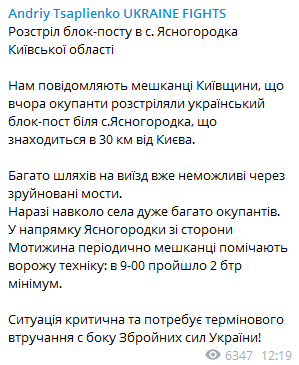 "Сейчас вокруг села очень много оккупантов. По направлению Ясногородки со стороны Мотыжина периодически жители замечают вражескую технику: в 09:00 прошло 2 БТР минимум. Ситуация критическая и нуждается в срочном вмешательстве со стороны Вооруженных сил Украины!", - написал Цаплиенко