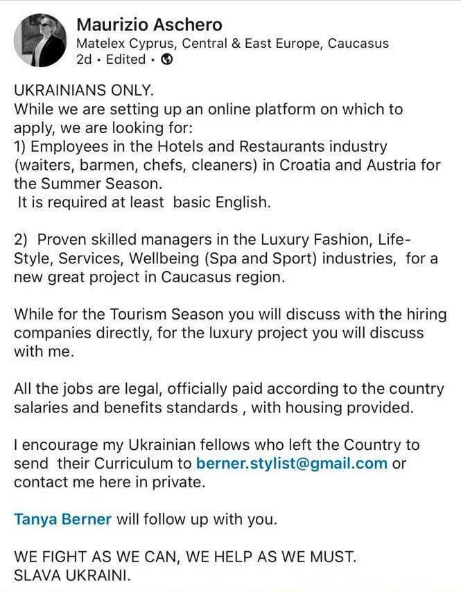Тем временем некоторые работодатели начали размещать объявления о найме на работу украинцев. Основатель компании Matelex Маурицио Асчеро ищет через сеть профессиональных контактов LinkedIn сотрудников в свои отели и рестораны в Хорватии и Австрии на летний сезон (барменов, официантов, поваров, уборщиков). Требуется хотя бы минимальное знание английского языка.