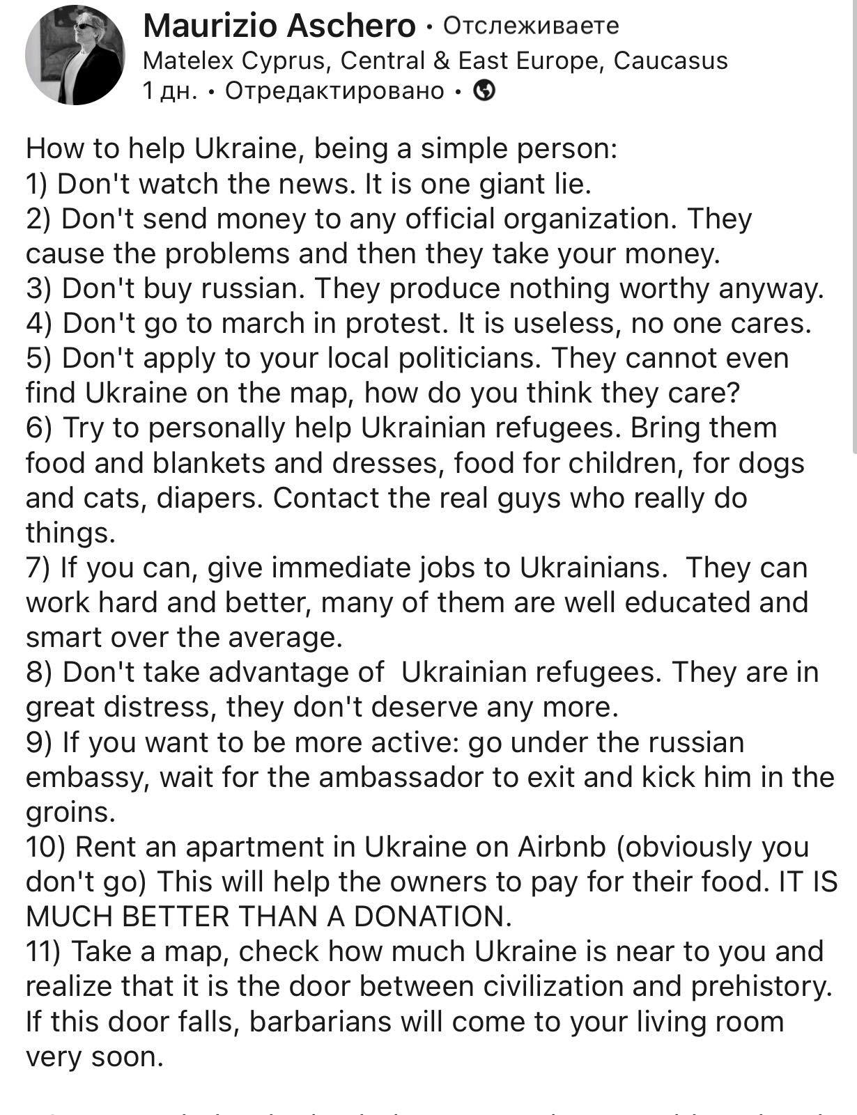 Предприниматель также советует иностранцам, как помочь Украине, будучи простым человеком. Среди советов - не отправлять деньги никаким официальным организациям: "Они создают проблемы, а затем забирают ваши деньги". Не выходить на марши протеста в Европе: "Это бесполезно, никому нет дела". Не обращаться к своим местным политикам: "Они даже не могут найти Украину на карте, какое им дело? Попробуйте лично помочь украинским беженцам. Принесите им еду и одеяла и платья, еду для детей, для собак и кошек, подгузники. Если можете, немедленно дайте работу украинцам. Они могут работать много и лучше, многие из них хорошо образованы и умны. Не используйте украинских беженцев. У них большое горе".