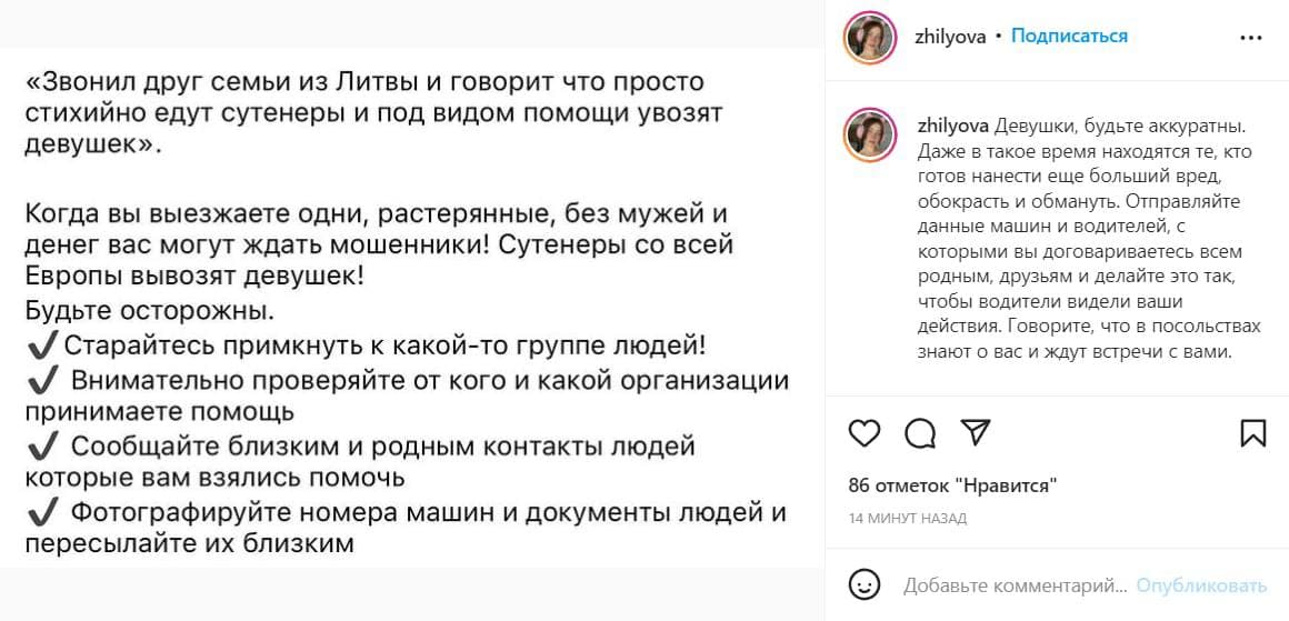 В связи с этим дизайнер призвала всех покидающих страну соблюдать меры безопасности - быть в группе, а не перемещаться в одиночку, внимательно разбираться кто именно предлагает помощь, передавать близким информацию о своем местоположении и людях, которые вызвались помочь.