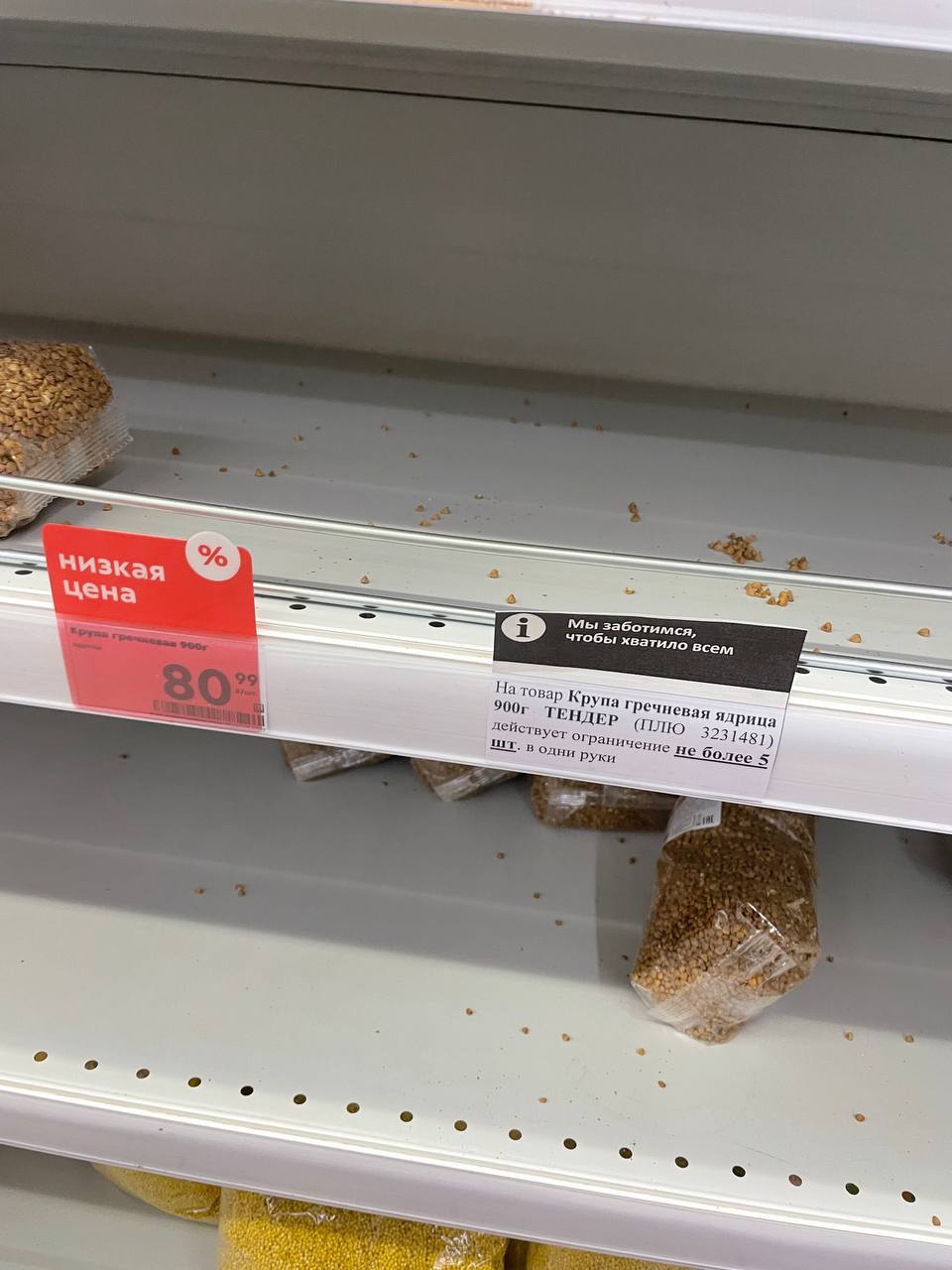 19.02 В супермаркетах в Московской области люди раскупают рис, гречка, сахар - продают 5 штук в одни руки. И самые дешёвые сорта раскупили полностью. На не самые дешёвые сорта ограничений нет и они в наличии.