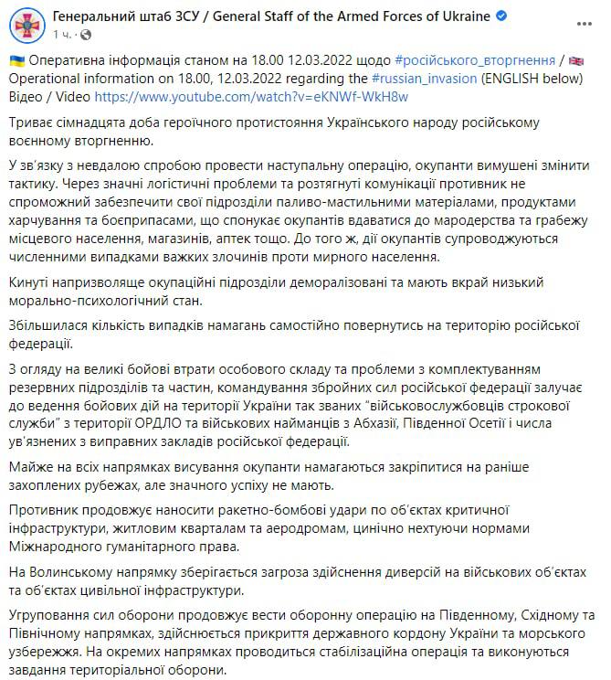 В субботу, 12 марта, идет семнадцатый день войны в Украине. Войска РФ продолжают окружать Киев, утром войска РФ сбросили на Васильков минимум 6 ракет. Поврежден склад с боеприпасами