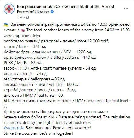 Так, с момента вторжения 24 февраля российско-оккупационные войска понесли следующие потери: