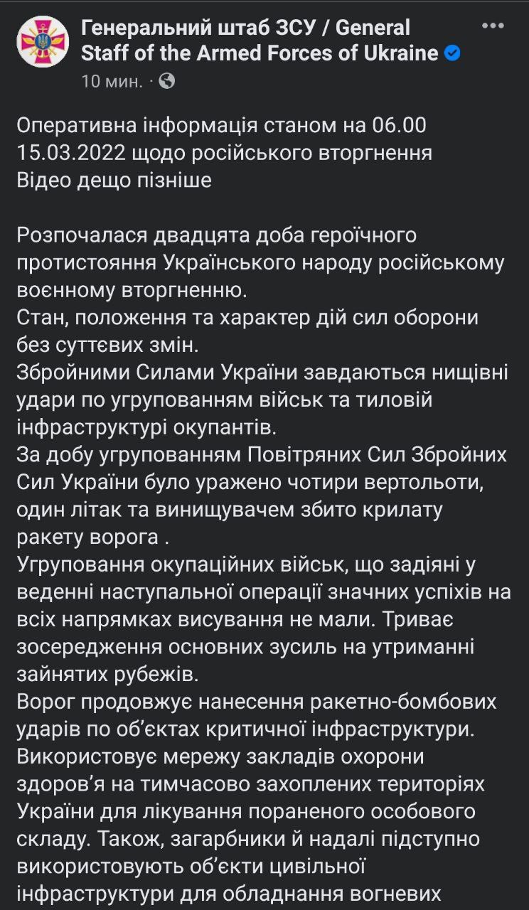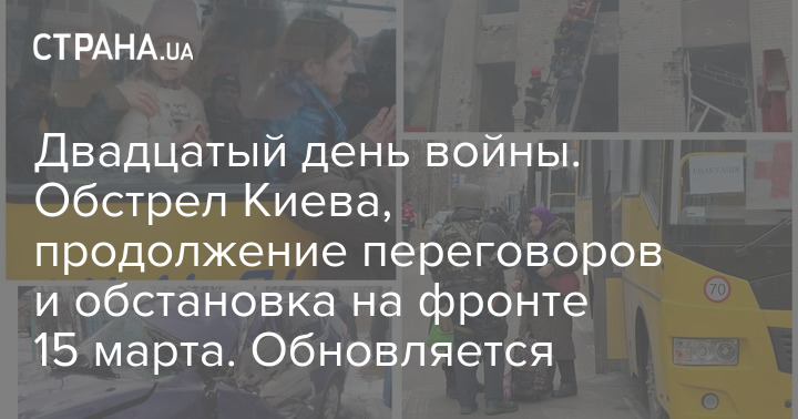 Во вторник, 15 марта, идёт двадцатый день войны в Украине. Утром российские снаряды попали в многоэтажку Подольского района Киева, жилые дома в Святошинском и Дарницких районах, ударной волной повредило станцию метро Лукьяновская. Информация о пострадавших уточняется.