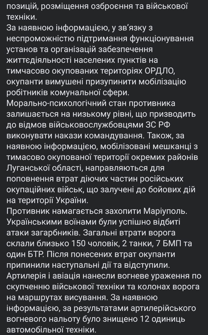 06.54 Новая сводка Генштаба ВСУ. Один из главных посылов утренней сводки Генштаба - все атаки на Мариуполь отбиты, противник понес потери и отступил.