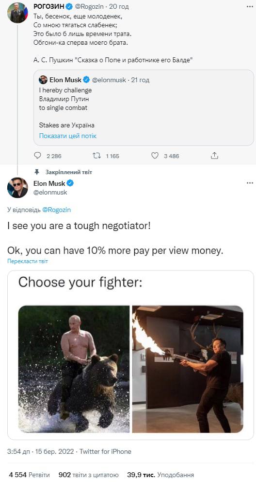 10.31 Маск ответил на твит Рогозина о поединке Илона Маска и Владимира Путина.
