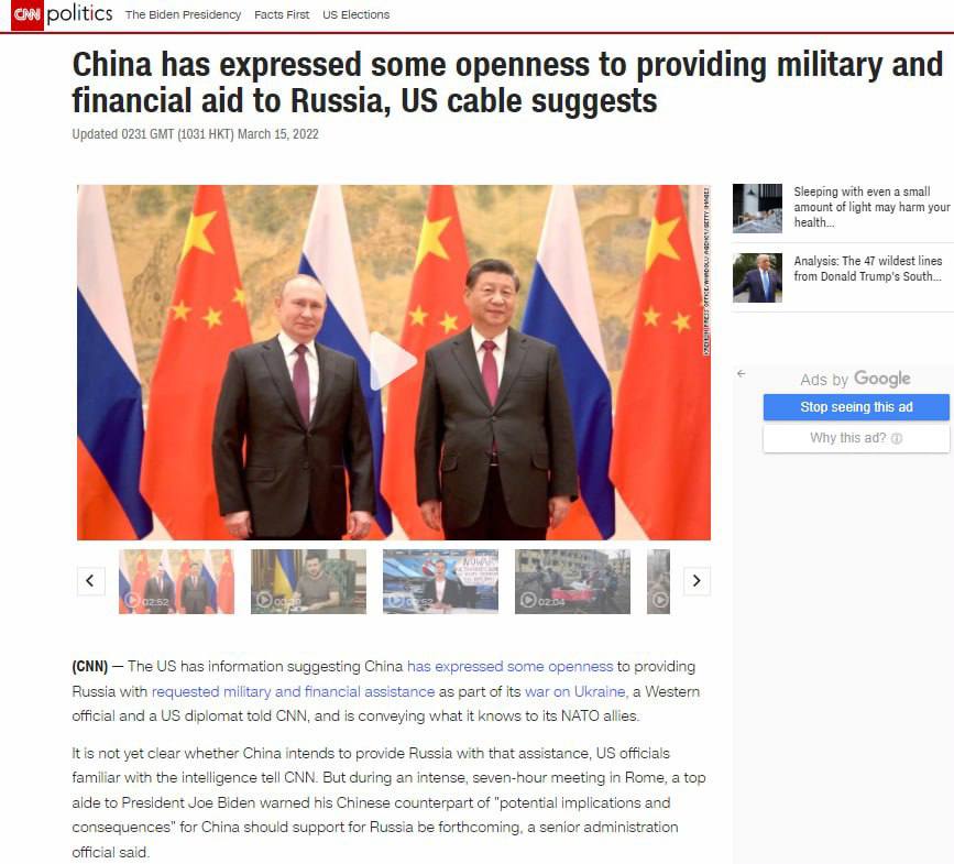 11.10 У США есть информация, что Китай выразил готовность предоставить России запрошенную военную и финансовую помощь во время войны с Украиной. Об этом пишет CNN со ссылкой на слова западного чиновника и американского дипломата.