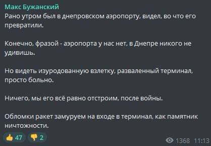 10.46 Губернатор Днепропетровской области сообщает о масштабном ракетном ударе по аэропорту Днепра. Повреждена взлетно-посадочная полоса и терминал.