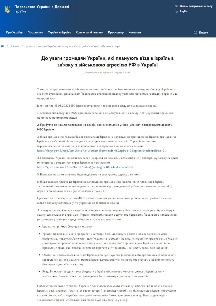 16.16 Израиль сможет принять не более 5 тысяч украинцев - им нужно подать заявку и получить разрешение от МВД Израиля, которое предоставляется только определенным категориям граждан. Об этом говорится на сайте посольства Украины в Израиле.