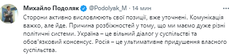 "Стороны активно выражают свои позиции уже уточненные. Коммуникация тяжело, но идет. Причина разногласий в том, что у нас очень разные политические системы. Украина - свободный диалог в обществе и обязательный консенсус. Россия - это ультимативное подавление собственного общества", - написал Подоляк.