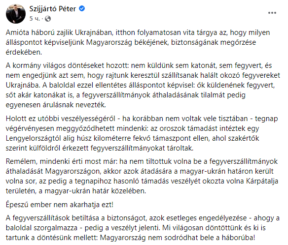 "Надеюсь, теперь все понимают, что если бы мы не запретили прохождение партий оружия через Венгрию, то оно было бы сдано на венгерско-украинской границе, что создало бы угрозу нападения, аналогичного вчерашнему на Закарпатье, в районе венгерско-украинской границы", - сообщил глава МИД.