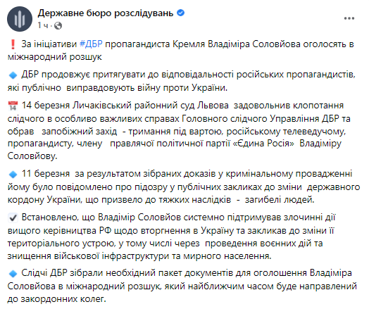 "Установлено, что Владимир Соловьев системно поддерживал преступные действия высшего руководства РФ по вторжению в Украину и призвал к изменению ее территориального устройства, в том числе через проведение военных действий и уничтожение военной инфраструктуры и мирного населения", - говорится в сообщении ГБР.