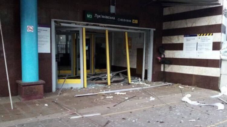 На станции метро "Лукьяновская" в Киеве после обстрела поврежден фасад здания. Поезда на "Лукьяновке" пока останавливаться не будут.