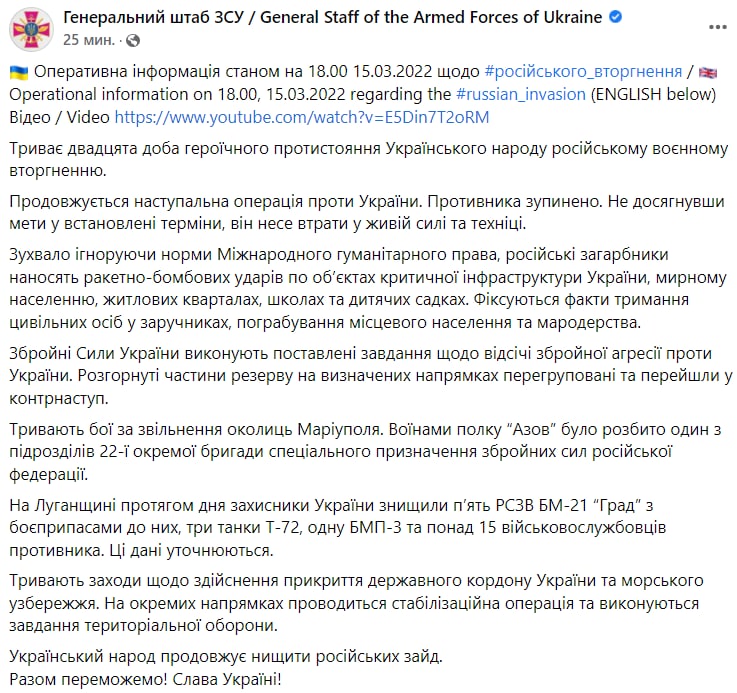 15 марта 2022 года идет двадцатый день войны. В нашем онлайне — главное об обстановке в городах Украины и на фронтах.