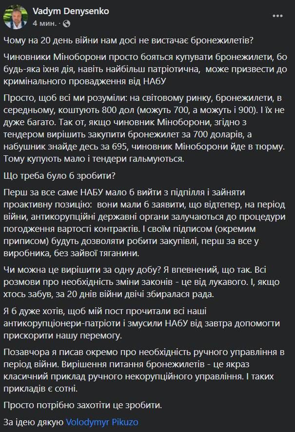 "Не хочу много писать о больших тяготах руководителя НАБУ Артема Сытника, который вместе со своей правой рукой Калужанским под охраной своего спецназа скрылись во Львове и, как говорится, меняет конспиративное (!) жилье пару раз в неделю", - пишет Денисенко.