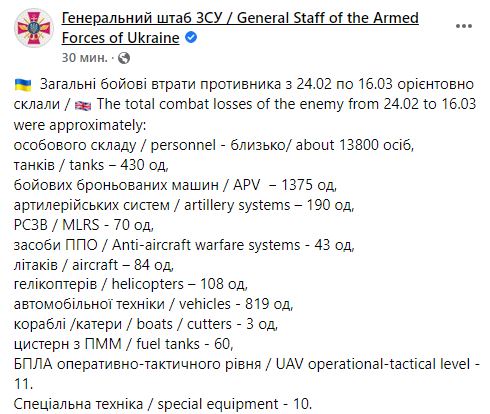 09.26 Общие боевые потери противника с 24 февраля по 16 марта по данным Генштаба ВСУ