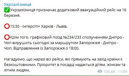 11.32 Укрзализныця назначает дополнительный эвакуационный рейс на 16 марта.