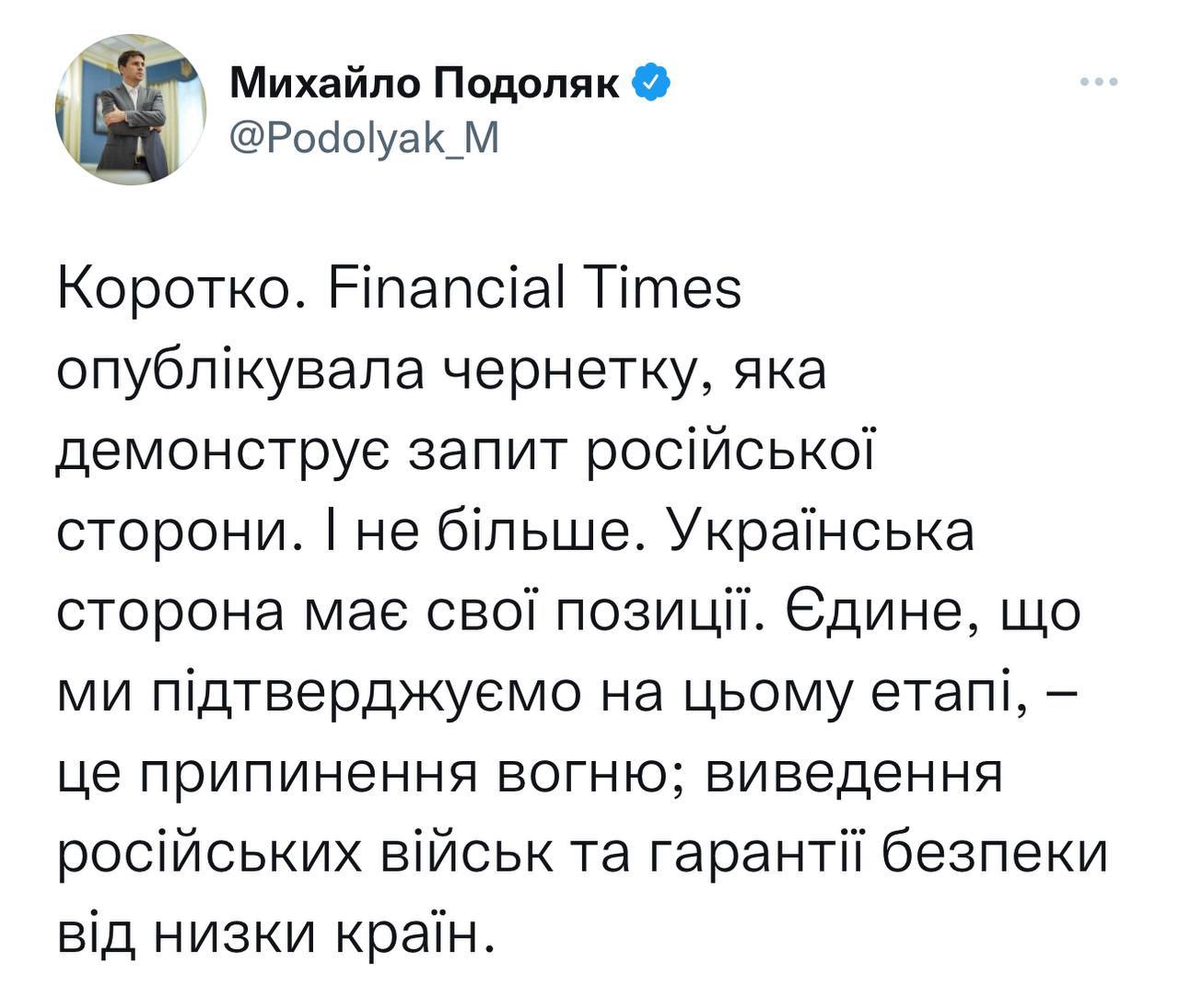 18.54 Михаил Подоляк назвал опубликованную Файненшл Таймс информацию о плане по нейтралитету Украины из 15 пунктов черновиком, "демонстрирующим запрос российской стороны. И не больше. У украинской стороны свои позиции. Единственное, что мы подтверждаем на этом этапе – это прекращение огня; вывод российских войск и гарантии сохранности от ряда государств".