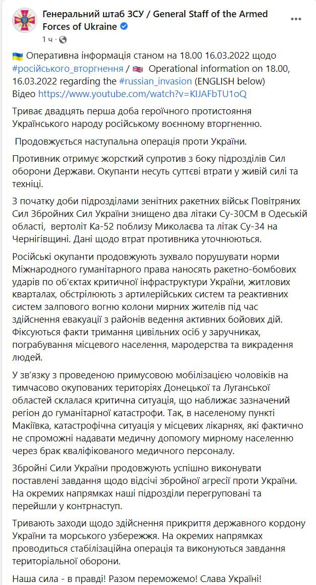 20.21 Сводка Генштаба ВСУ на 18.00 вечера. Подразделениями зенитных ракетных войск Воздушных Сил ВСУ уничтожены два самолета Су-30СМ в Одесской области, вертолет Ка-52 вблизи Николаева и самолет Су-34 в Черниговской области.