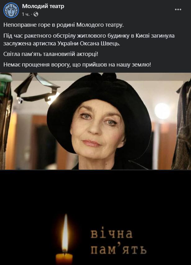 18.16 Во время ракетного обстрела Киева погибла заслуженная артистка Украины Оксана Швец. Информацию об этом сообщили в "Молодом театре".